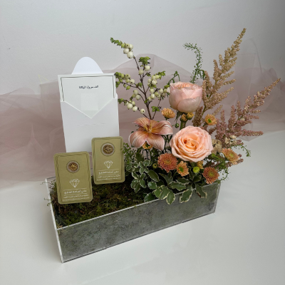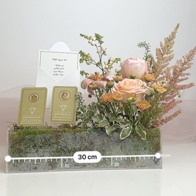 Flower tray with half and quarter Ottoman Lira, 22K gold — Note: flower type and color based on availability — Half Lira weight: 3.6g — Quarter Lira weight: 1.8g